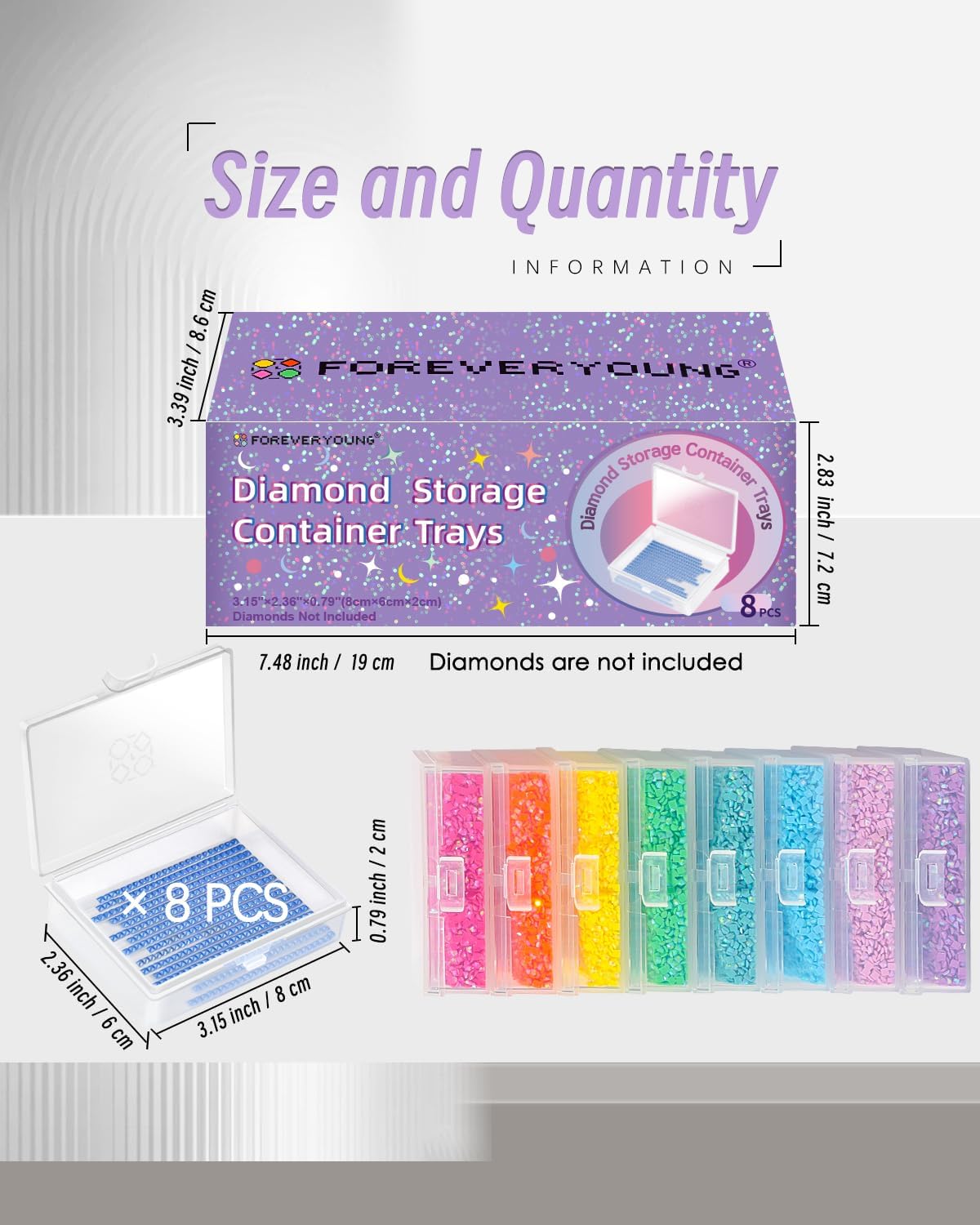 - What You Get: 8pcs diamond art storage containers, and a beautiful purple paper box, perfect for organizing your diamonds. This diamond art organizer is part of a comprehensive diamond painting kits that includes essential diamond art tools and diamond art supplies. With the diamond painting storage box, you’ll easily manage and store your diamonds, making it a valuable addition to your diamond art accessories.